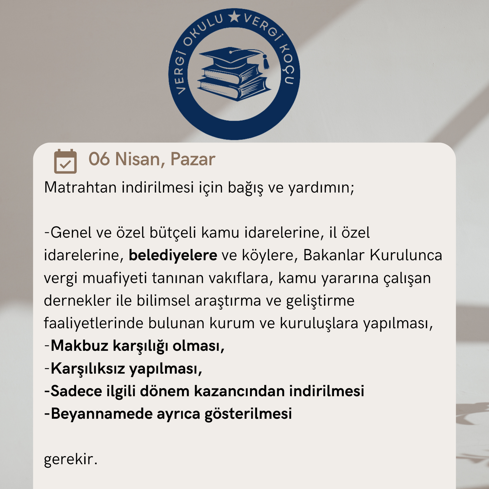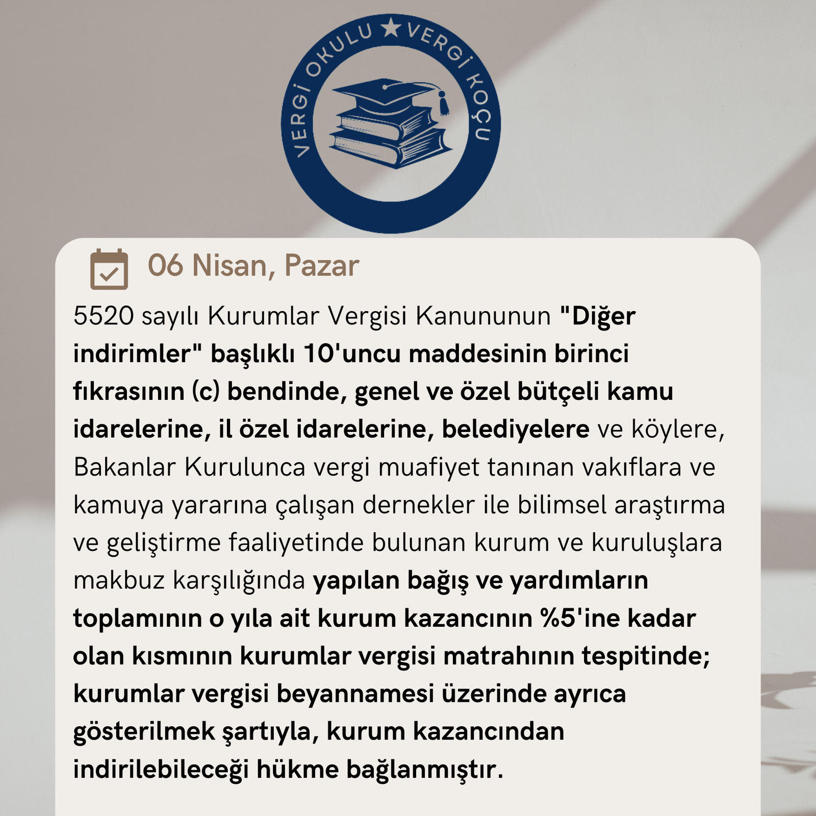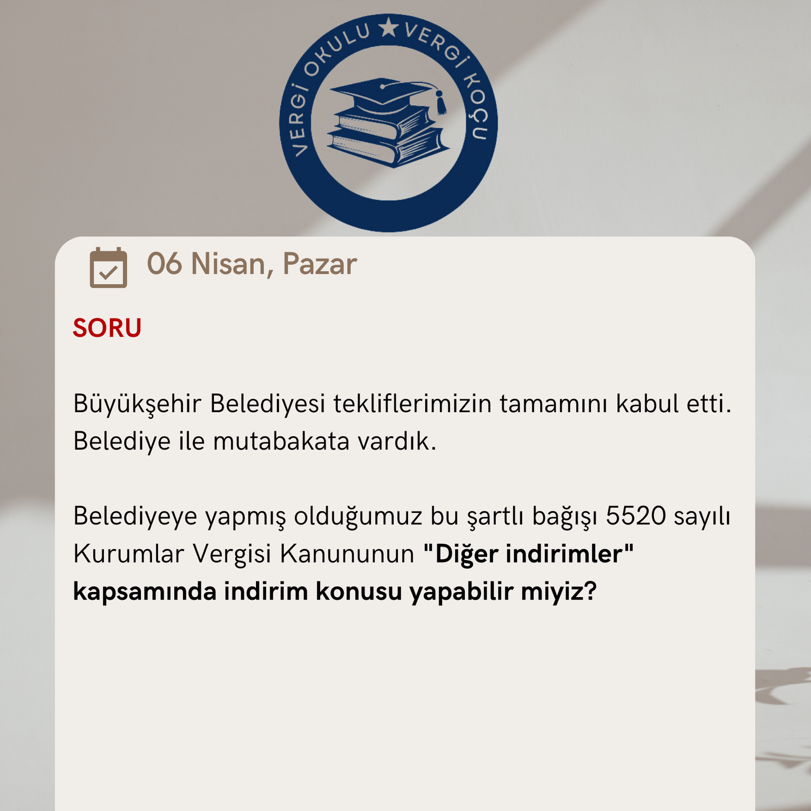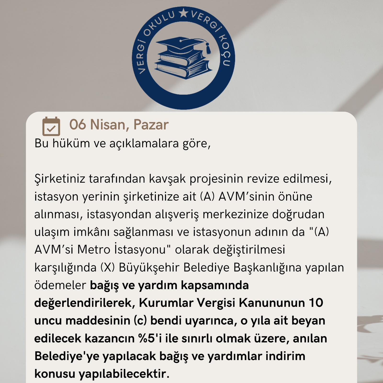 | SORU Şirketimizce (A) adında A.V.M. yaptık. Gayet güzelde işletiyoruz. (X) Büyükşehir Belediyesi, A.V.M.’ mizin bulunduğu cadde üzerinde, yol revizyonu ve metro çalışmasına başladı. -Şirketimizce (X) Belediyesine şöyle bir teklif yaptık: -Büyükşehir Belediye Başkanlığınıza 4.000.000 TL şartlı bağış yapalım, -Belediyenizin kavşak projesinin revize edin, İstasyon yerinin şirketimize ait (A) A.V.M’ nin önüne alın, -Metro istasyonundan alışveriş merkezinize doğrudan ulaşım imkânı olsun (ve) -İstasyon adının da “(A) A.V.M.’si Metro İstasyonu” olarak değiştirin. Büyükşehir Belediyesi tekliflerimizin tamamını kabul etti. Belediye ile mutabakata vardık. Belediyeye yapmış olduğumuz bu şartlı bağışı 5520 sayılı Kurumlar Vergisi Kanununun “Diğer indirimler” kapsamında indirim konusu yapabilir miyiz? |