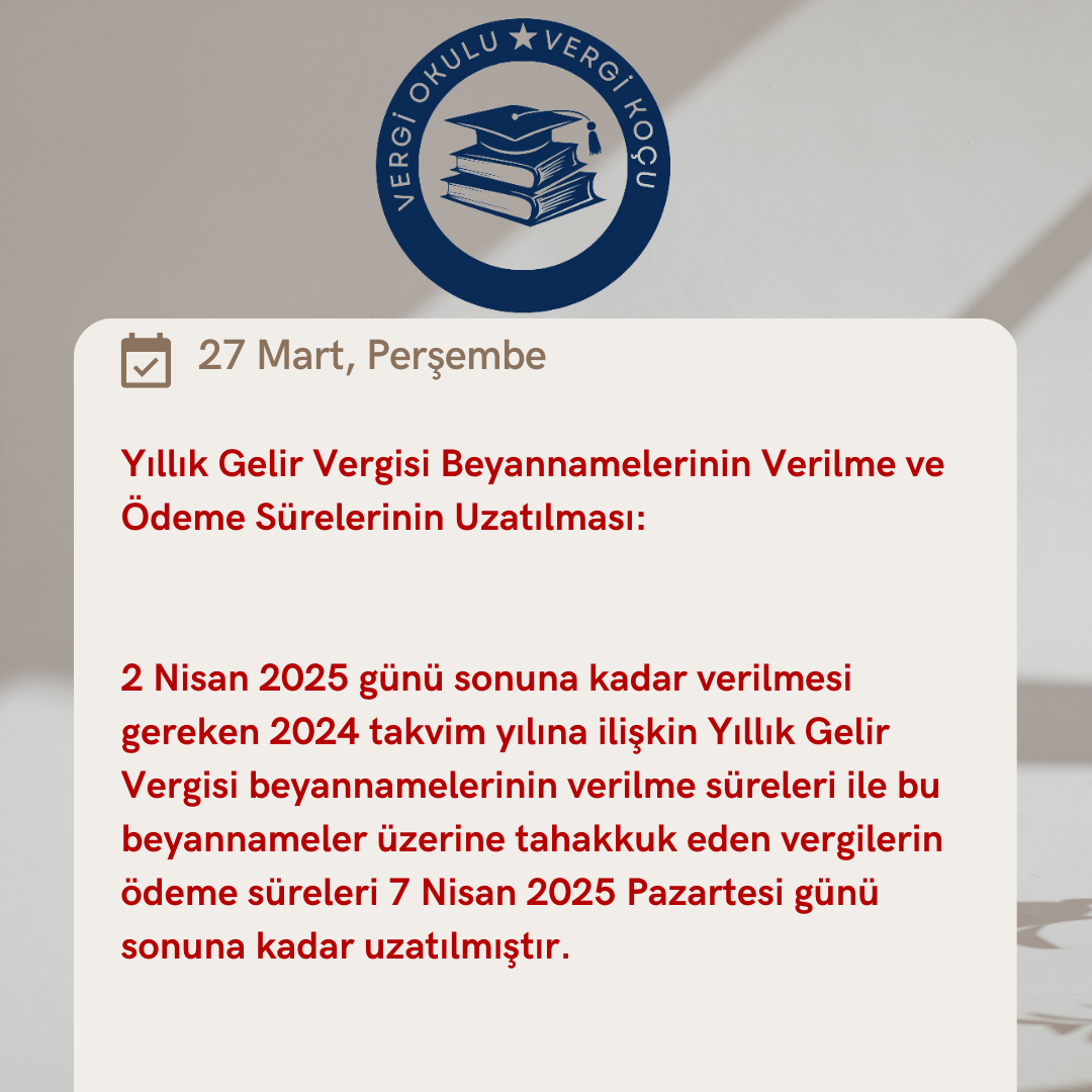 2 Nisan 2025 günü sonuna kadar verilmesi gereken 2024 takvim yılına ilişkin Yıllık Gelir Vergisi beyannamelerinin verilme süreleri ve bu beyannameler üzerine tahakkuk eden vergilerin ödeme sürelerinin uzatılması.