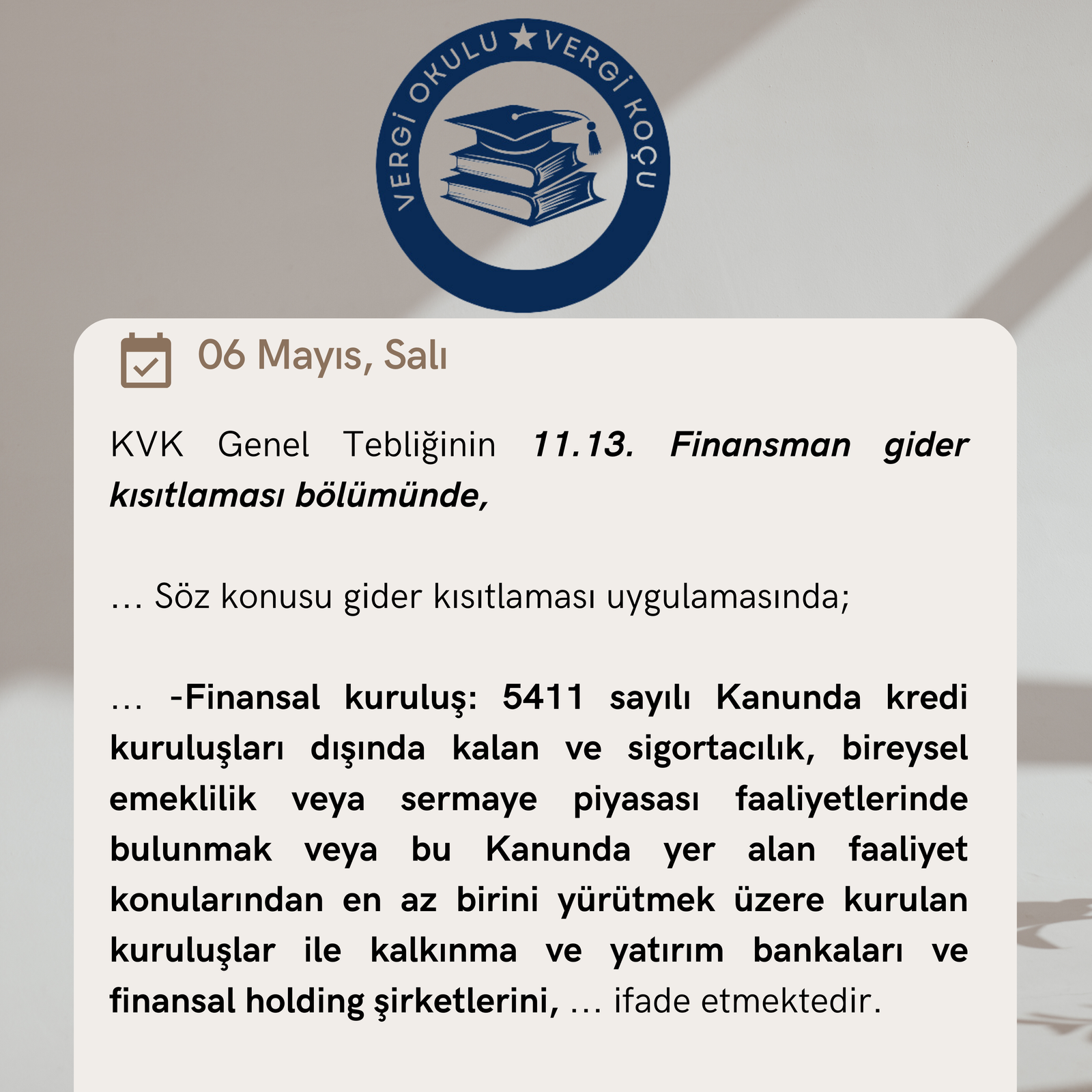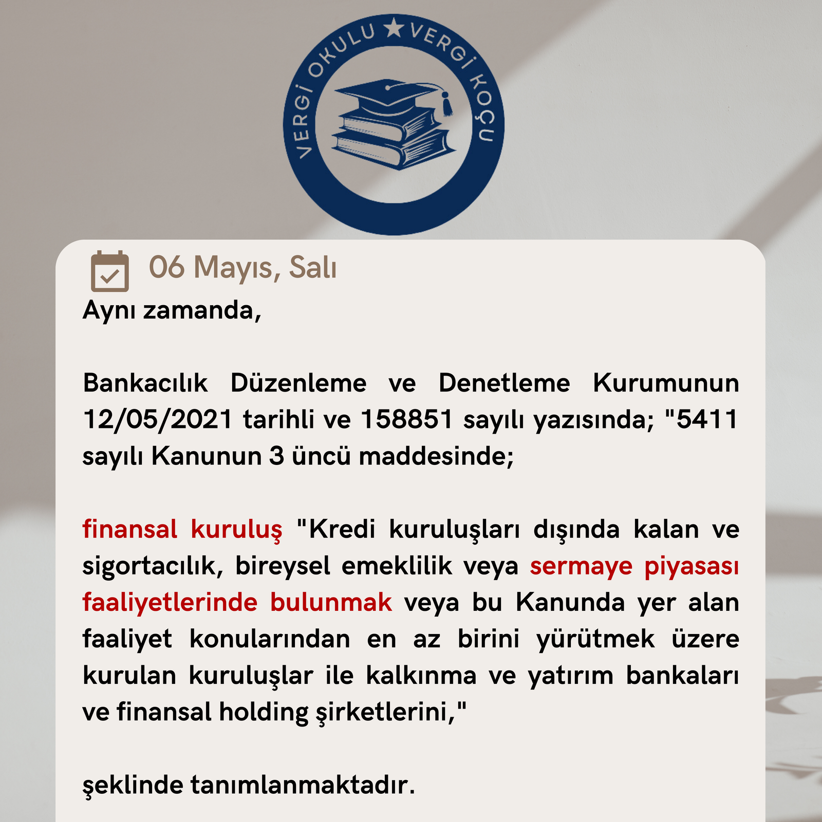 Bankacılık Düzenleme ve Denetleme Kurumunun 12/05/2021 tarihli ve 158851 sayılı yazısında; “5411 sayılı Kanunun 3 üncü maddesinde;